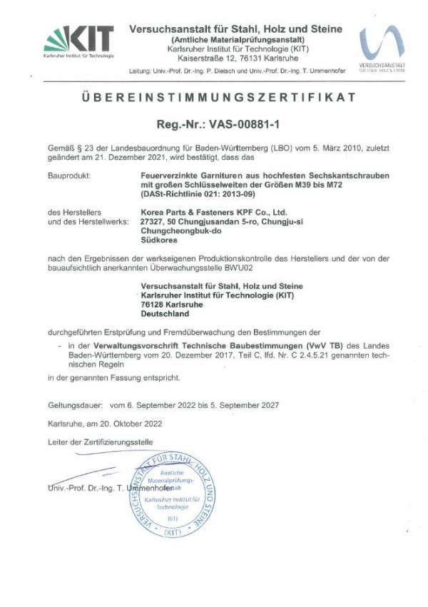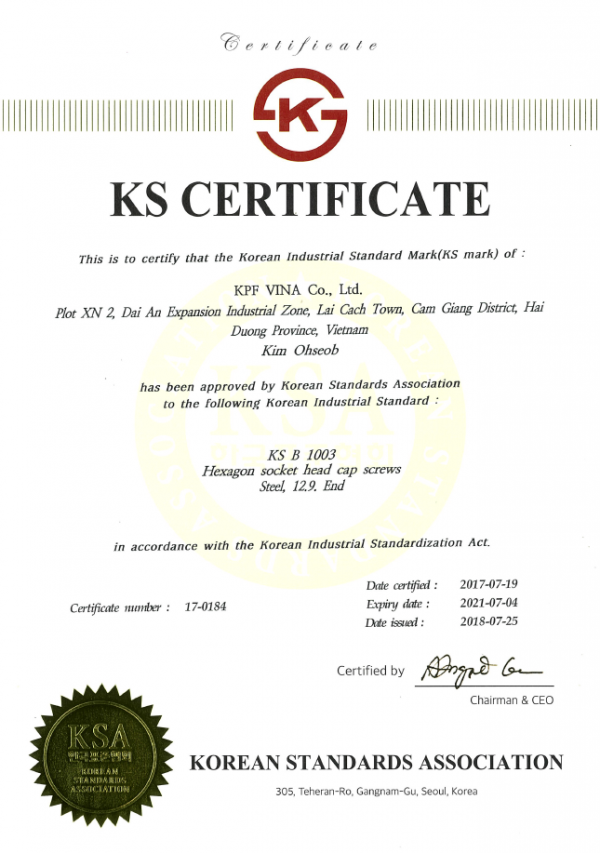 KPF VINA는 유럽 건설용 화스너 시장 진출을 위해 2021년에 Non-preloaded bolt에 대한 국제 규격인 EN15048-1 인증을 취득하였습니다.