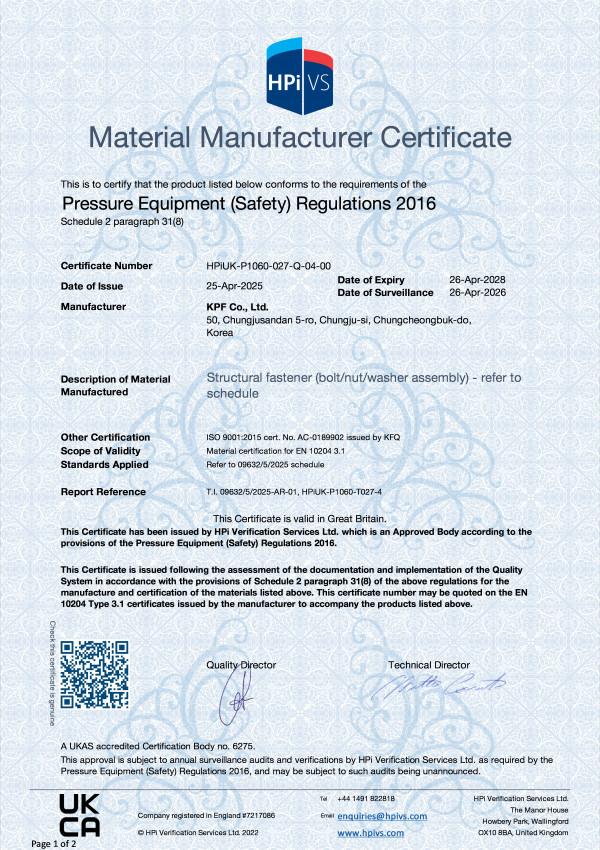 KPF는 영국 시장의 건설용 화스너 시장에 대한 점유율을 확대하기 위해 Non-preloaded bolt & nut assemblies 에 대해 규정한 국제 규격인 UKCA EN 15048-1 인증을 2022년에 취득하였습니다.